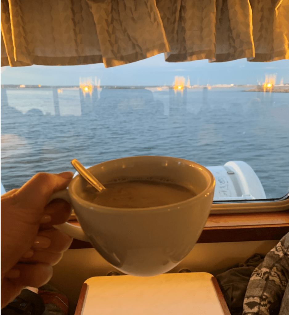 After spending the day on the island, we needed to warm up with a cup on Hot Chocolate on the Ferry. The ferries aren’t as fancy as the cafes, so this tasted like home (a Swiss Miss packet).
